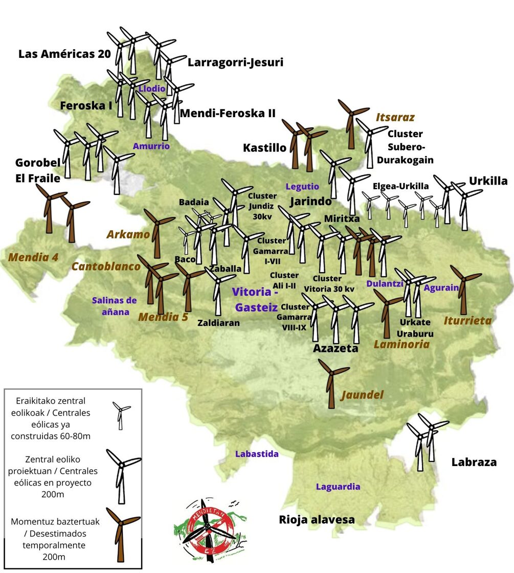No nos podemos olvidar, que todas las centrales eólicas que quieren construir están en zonas de exclusión para la implantación de parques eólicos y huertas solares según el Plan Mugarri (Plan de la Diputación Foral de Álava para la promoción y desarrollo de la energías renovables). Los actuales proyectos conllevan las siguientes afecciones: